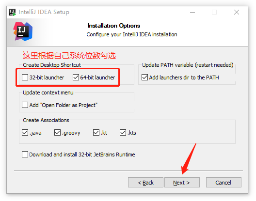 5、这里根据自己电脑系统位数勾选,其它选项根据自己需要勾选即可,选完点击【Next】下一步。