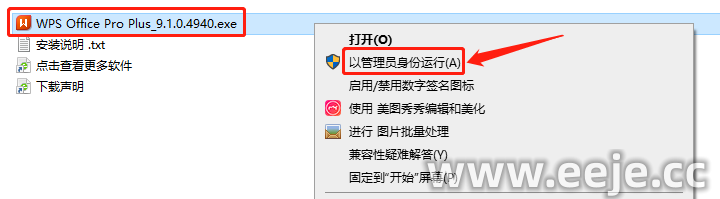 2、鼠标右键【WPS Office Pro Plus_9.1.0.4940.exe】,选择【以管理员身份运行】。