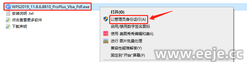 2、鼠标右键【WPS2019_11.8.6.8810_ProPlus_Vba_Pdf.exe】,选择【以管理员身份运行】。