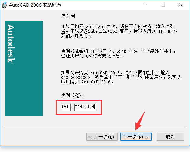 5、序列号输入191-75444444 , 在点击下一步