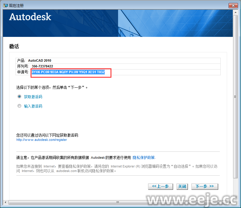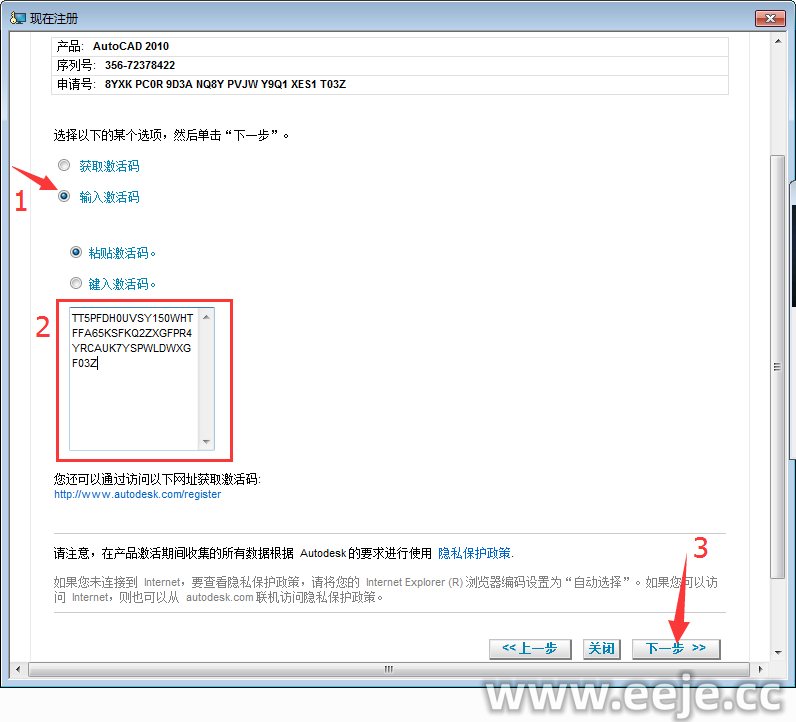 22、选择输入激活码,在把刚复制的激活码(用快捷键Ctrl+V)粘贴到框内,在点击下一步