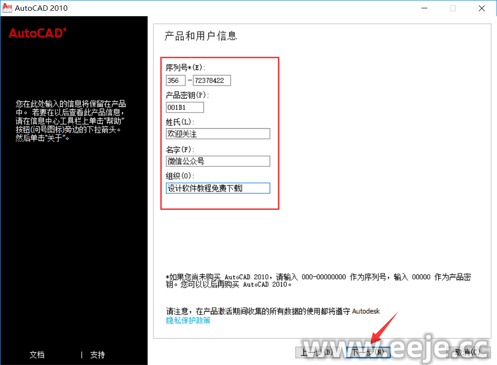 7、输入系列号:356-72378422 产品密钥:001B1,用户信息随便填写,填完点击下一步