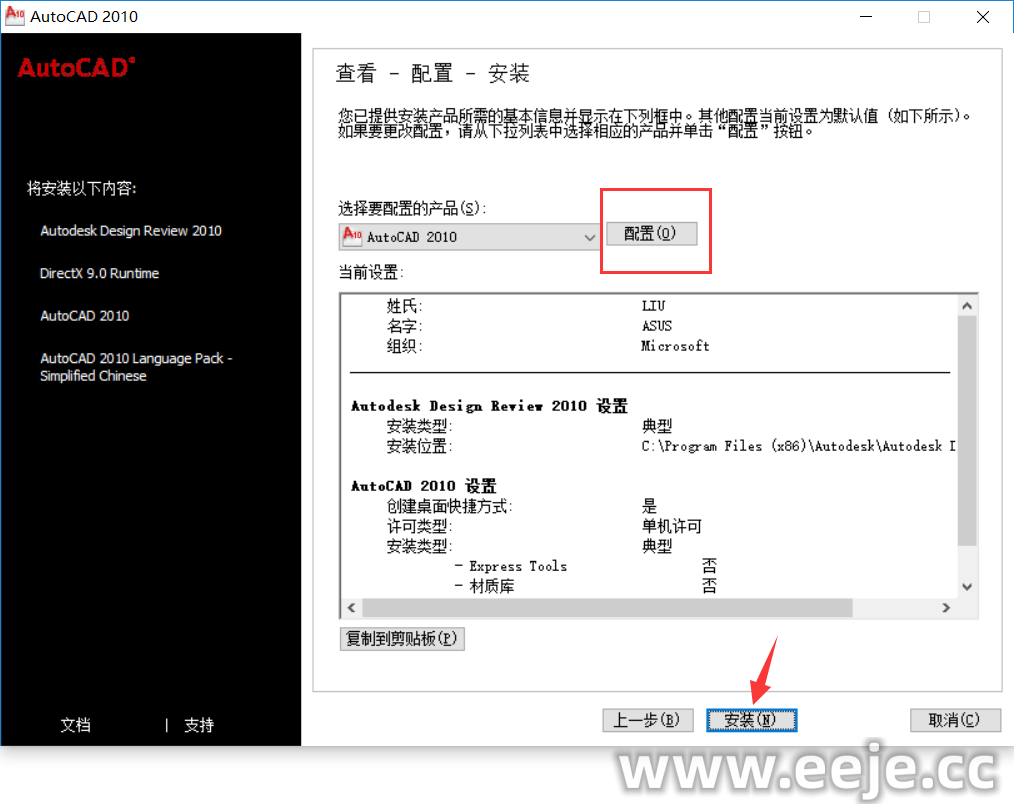 8、点击安装(默认安装在C盘),要更改安装位置点击配置自行设置