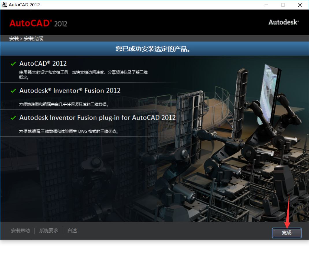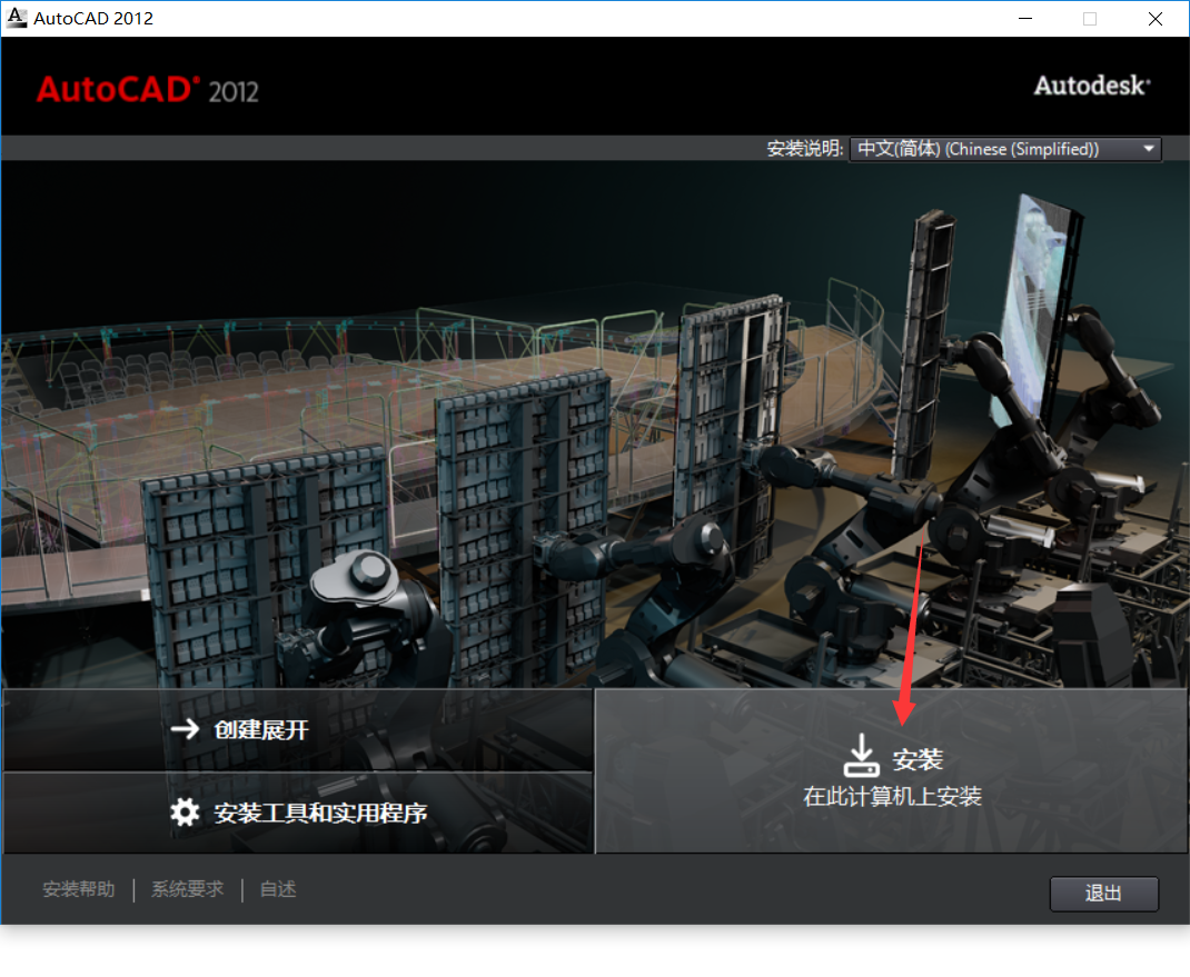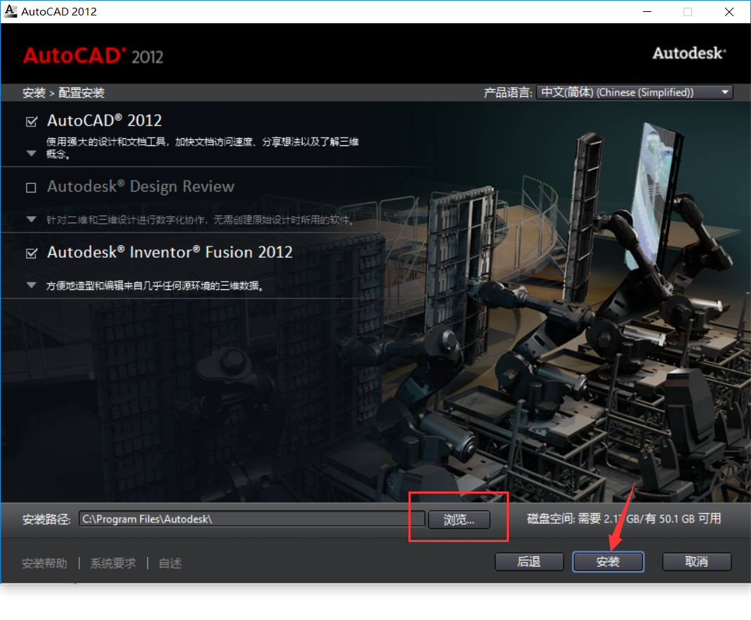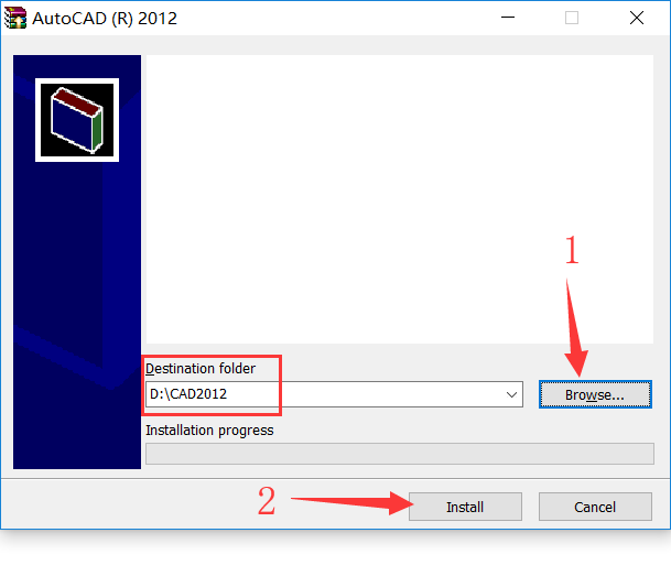 3、点击Browse选择解压目标文件夹(可在D盘或其它盘里面新建一个CAD2012文件夹)然后点击Install ,不更改解压位置也可以直接点击Install