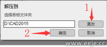 3、点击更改选择解压目标文件夹(可在D盘或其它盘里面新建一个CAD2015文件夹)然后点击确定