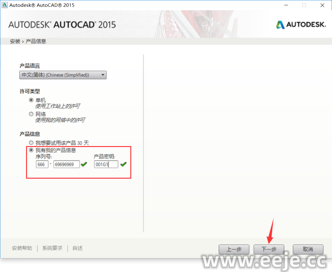 6、输入序列号:666-69696969,输入密钥:001G1,在点击下一步