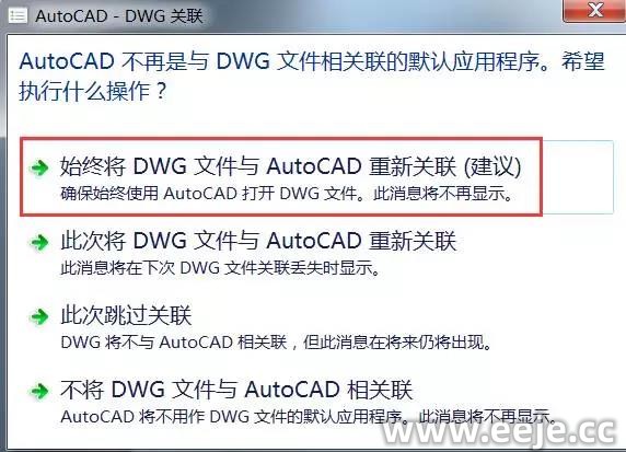 9、在电脑桌面上找到CAD软件图标后,双击打开。然后选择第一项:始终将DWG文件与AutoCAD重新关联