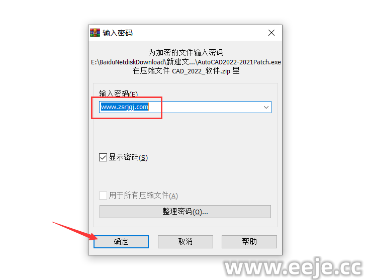 2、输入解压密码【www.zsrjgj.com】,再点击【确定】。