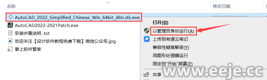 3、鼠标右击【AutoCAD_2022_Simplified_Chinese_Win_64bit_dlm.sfx】点击【以管理员身份运行】。
