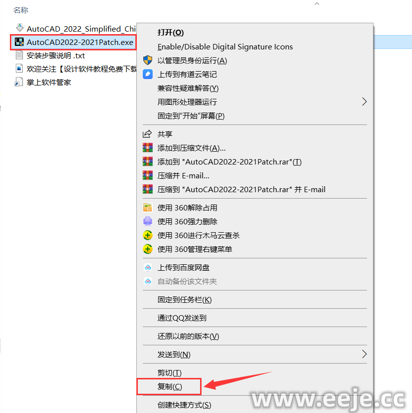 13、回到软件解压的文件夹内找到【AutoCAD2022-2021Patch.exe】文件,鼠标右击选择【复制】。