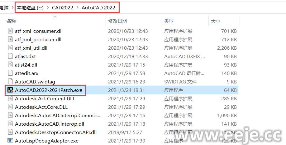 15、把刚复制的【AutoCAD2022-2021Patch.exe】文件粘贴到这里面。