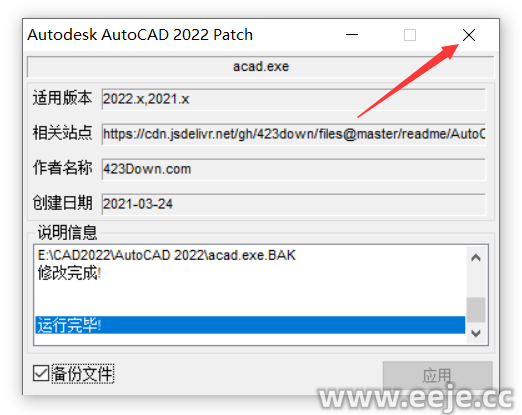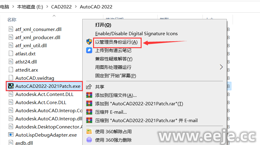 16、鼠标右击复制进来的【AutoCAD2022-2021Patch.exe】文件,选择【以管理员身份运行】。