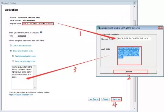 20、(用快捷键Ctrl+C)复制申请号(用快捷键Ctrl+V)粘贴到注册机上面第一个框内,再点击【Calculate】生成激活码,再用(快捷键Ctrl+C)复制注册机第二个框内计算出来的激活码,把复制的激活码(用快捷键Ctrl+V)粘贴到激活码框内,再点击【Next】下一步。