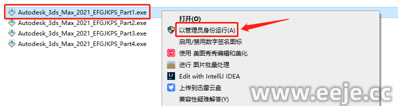 3、鼠标右击【Autodesk_3ds_Max_2021_EFGJKPS_Part1】,点击【以管理员身份运行】。