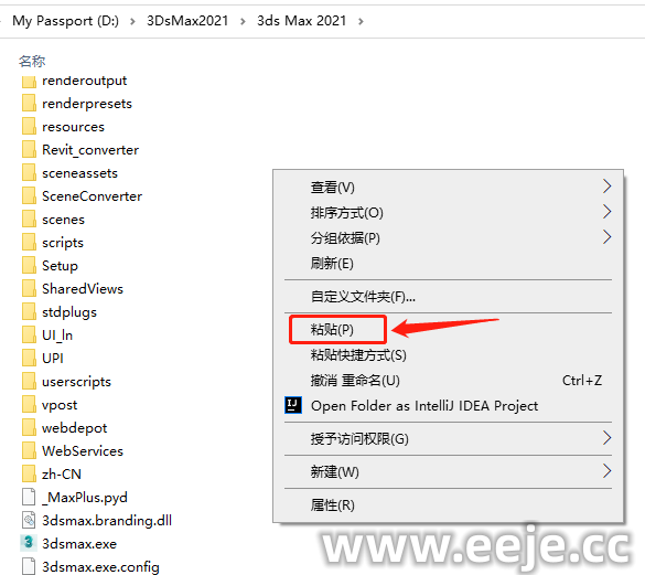 17、把刚复制的【3dsmax】文件,在空白处鼠标右击【粘贴】进去。