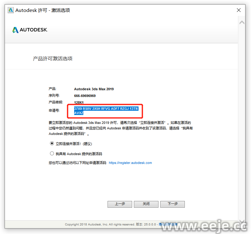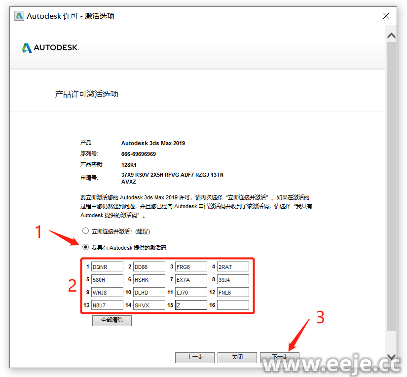 24、选择【我具有 Autodesk 提供的激活码】,把刚复制的【激活码】粘贴到框内,再点击【下一步】。