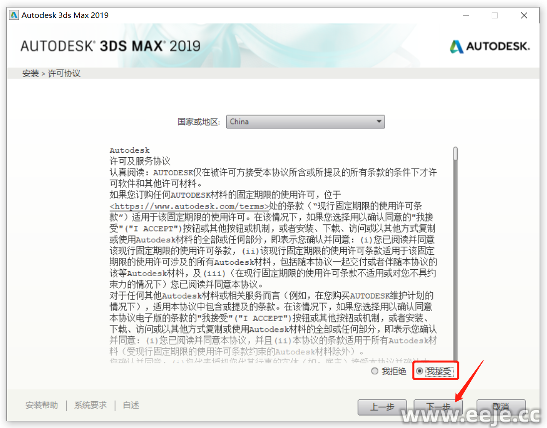 5、选择【我接受】,点击【下一步】。