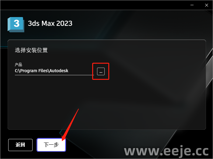6、点击三个小点【…】可以更改安装位置(建议不要安装在C盘,可以在D盘或其它磁盘下新建一个文件夹,我这里演示就不改了),点击【下一步】。(提示:安装路径中不能有中文)