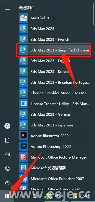 16、回到电脑桌面点击左下角【开始】图标,点击【3ds Max 2023 – Simplified Chinese】打开软件,也可以把这个软件用鼠标拖拽到桌面方便我们下次使用。