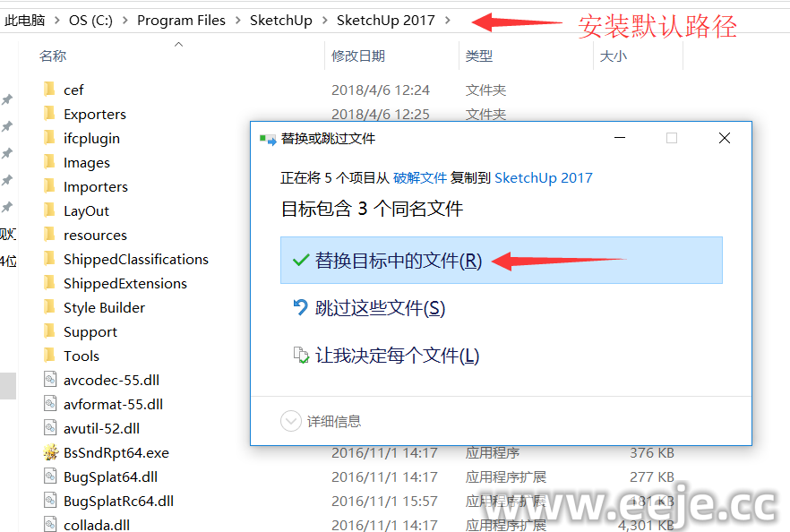 10、打开草图大师的安装目录,默认路径为【C:\Program Files\SketchUp\SketchUp 2017】,把刚复制的三个文件粘贴进去,点击【替换目标中的文件】。