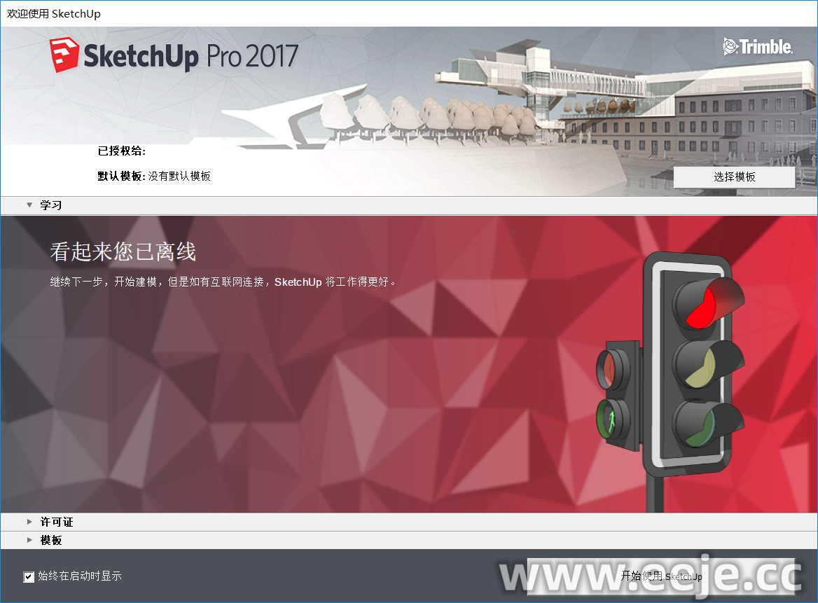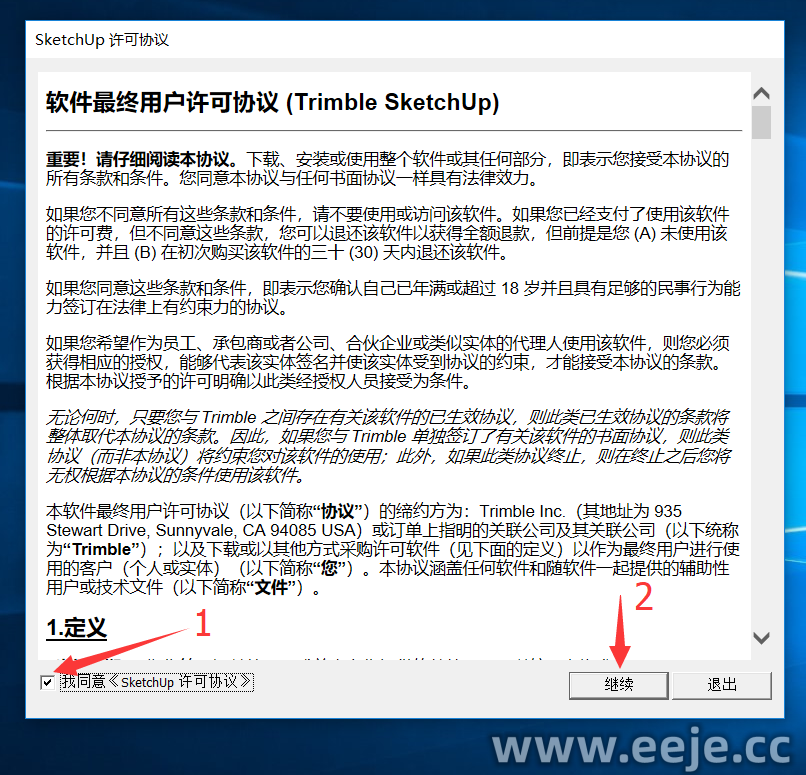12、在桌面打开【草图大师2017软件】,左下角【打勾我同意】,再点击【继续】。